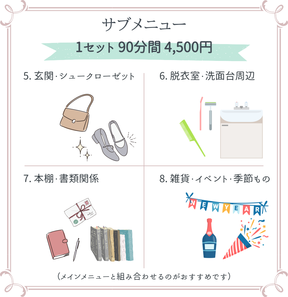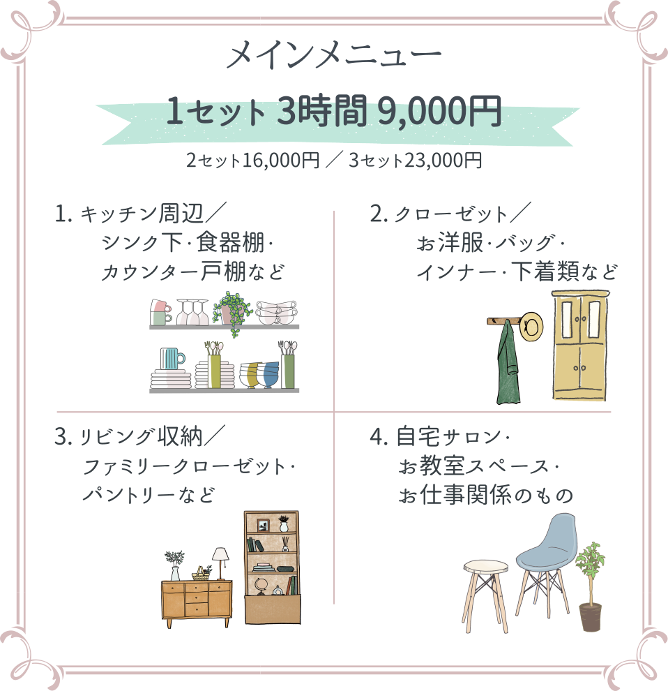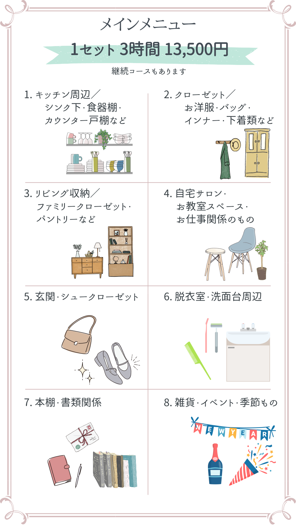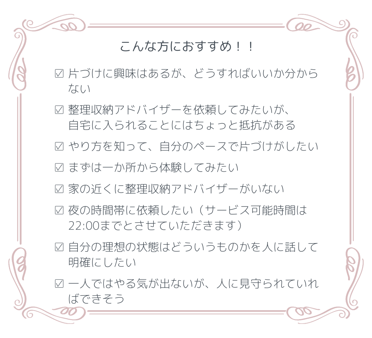 その場合も、なるべくきりの良いところまでサポートいたします。 ※ まずは、ご自分の判断で片づけられるものをして頂きたいので、お子様のおもちゃや服、ご家族の方の私物、ご主人に聞かないと分からないもの、などはおすすめしておりません。